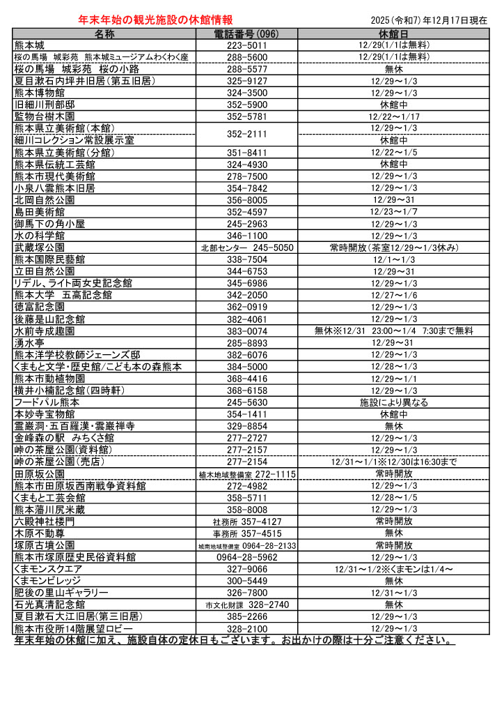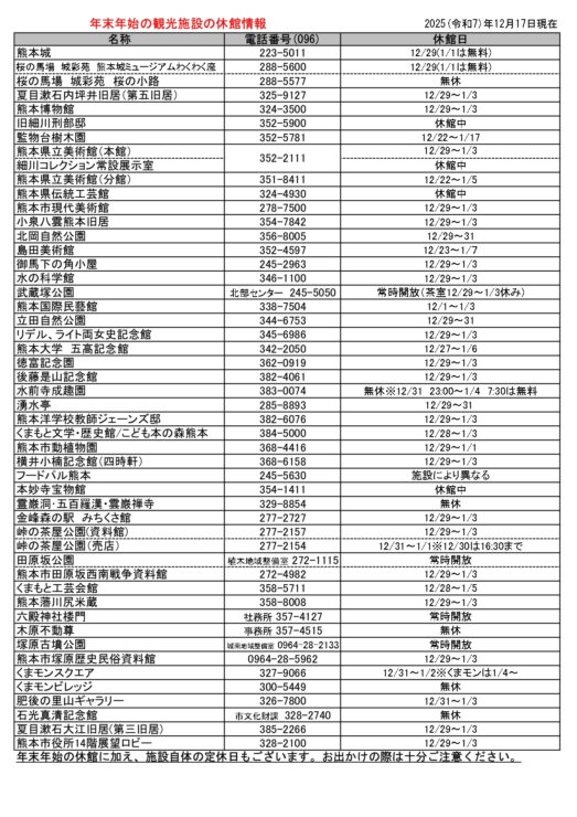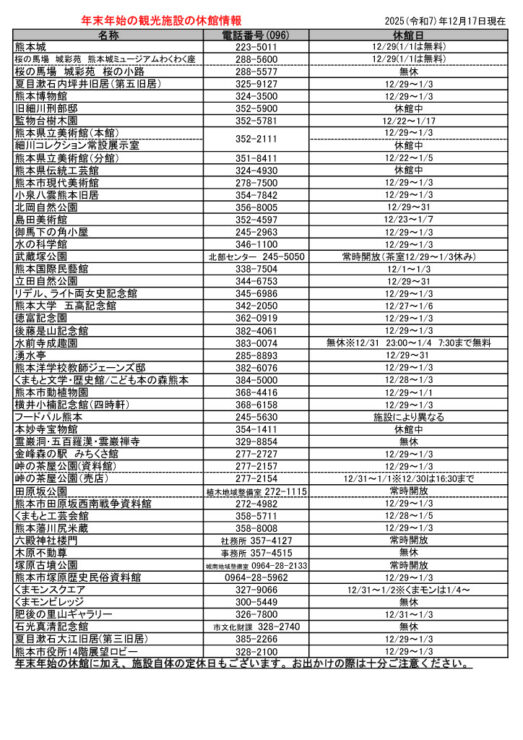 2025年度の熊本市内観光施設の年末年始の休館は以下の通りです。