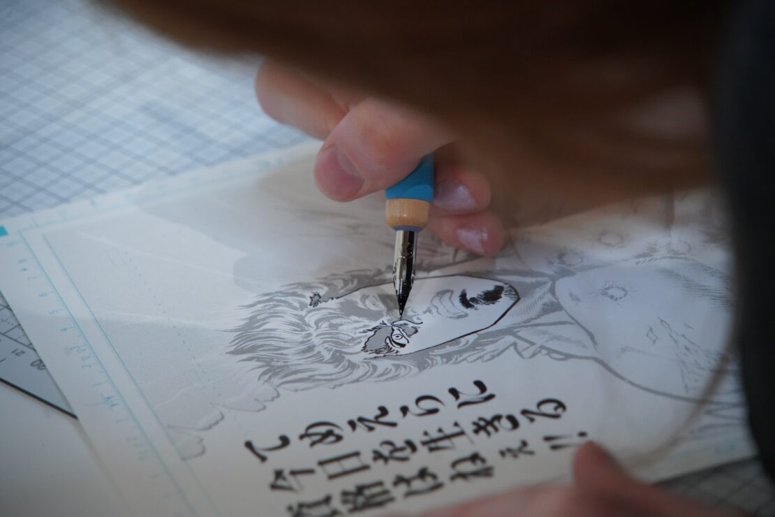 プロ仕様の道具を使って、『北斗の拳』『キャッツアイ』『シティーハンター』などの有名作品の原稿にペン入れ。
