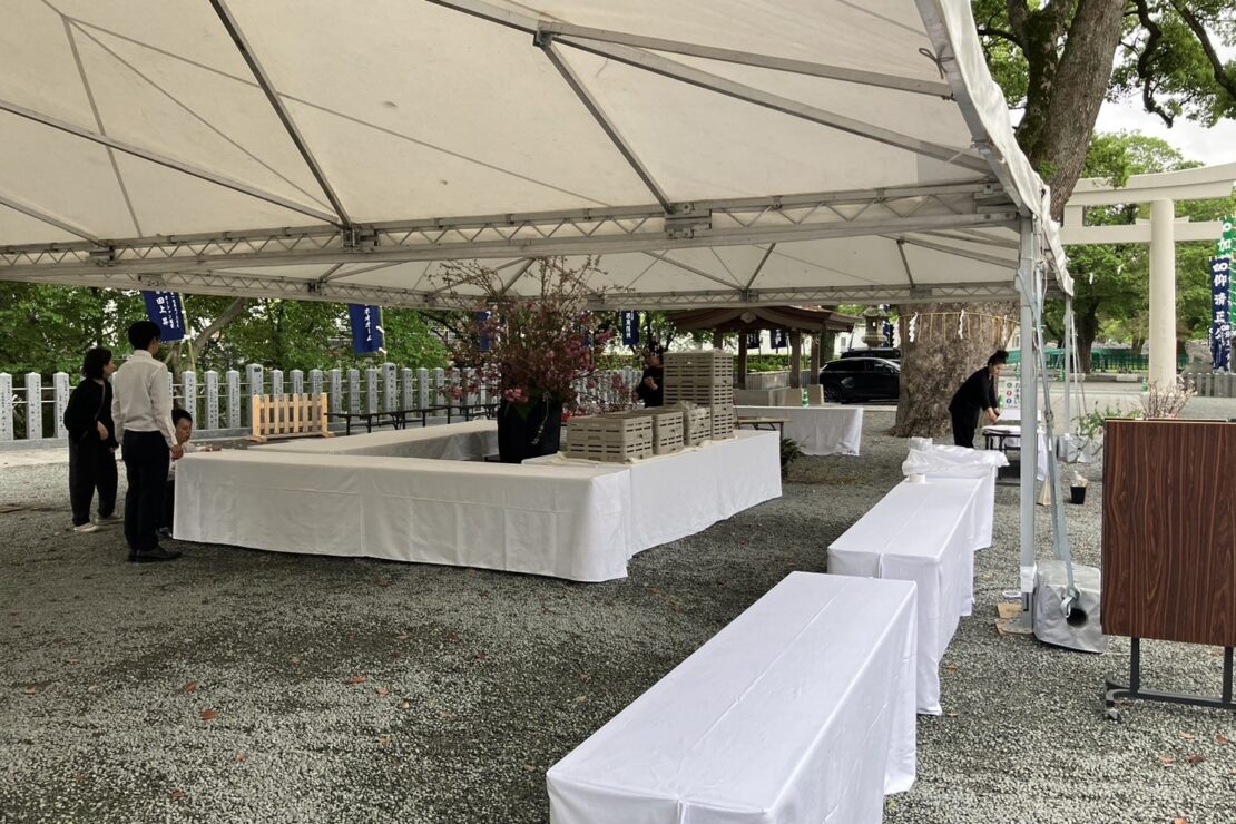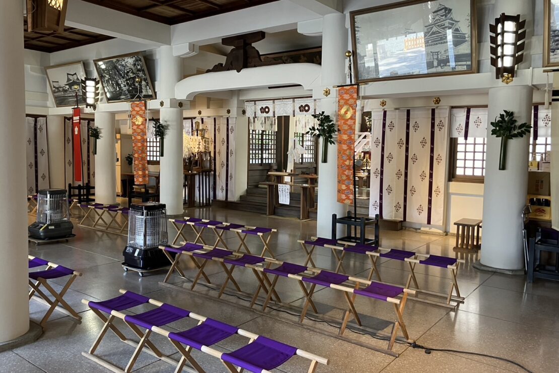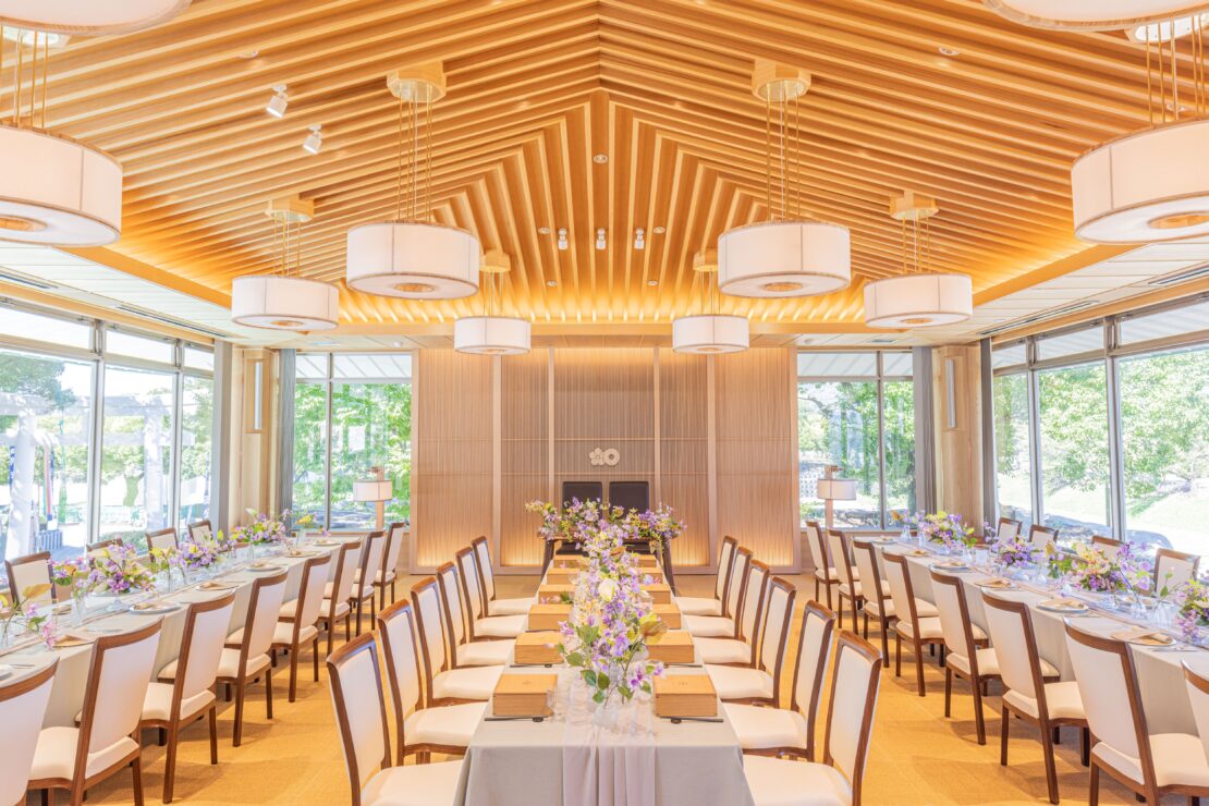 神社から眺める熊本城は、静寂で素晴らしい景色です。神社内には2024年秋にオープンした披露宴会場があり、屋内から熊本城天守閣を間近に臨む、贅沢な時間を過ごすことができます。また、境内からは地震被災から復旧した天守閣や、現在復旧工事中の国指定重要文化財「宇土櫓」も一望できます。拝殿の天井に飾られている横15m、縦5mの大天井画は必見。まずはご参拝頂き、境内を見学しながら熊本の歴史と日本文化に触れる、特別な懇親会をお楽しみください。