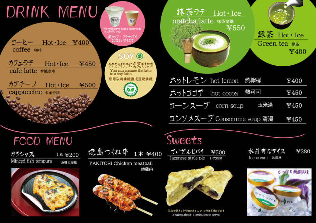 飲み物や軽食がテイクアウトできます。